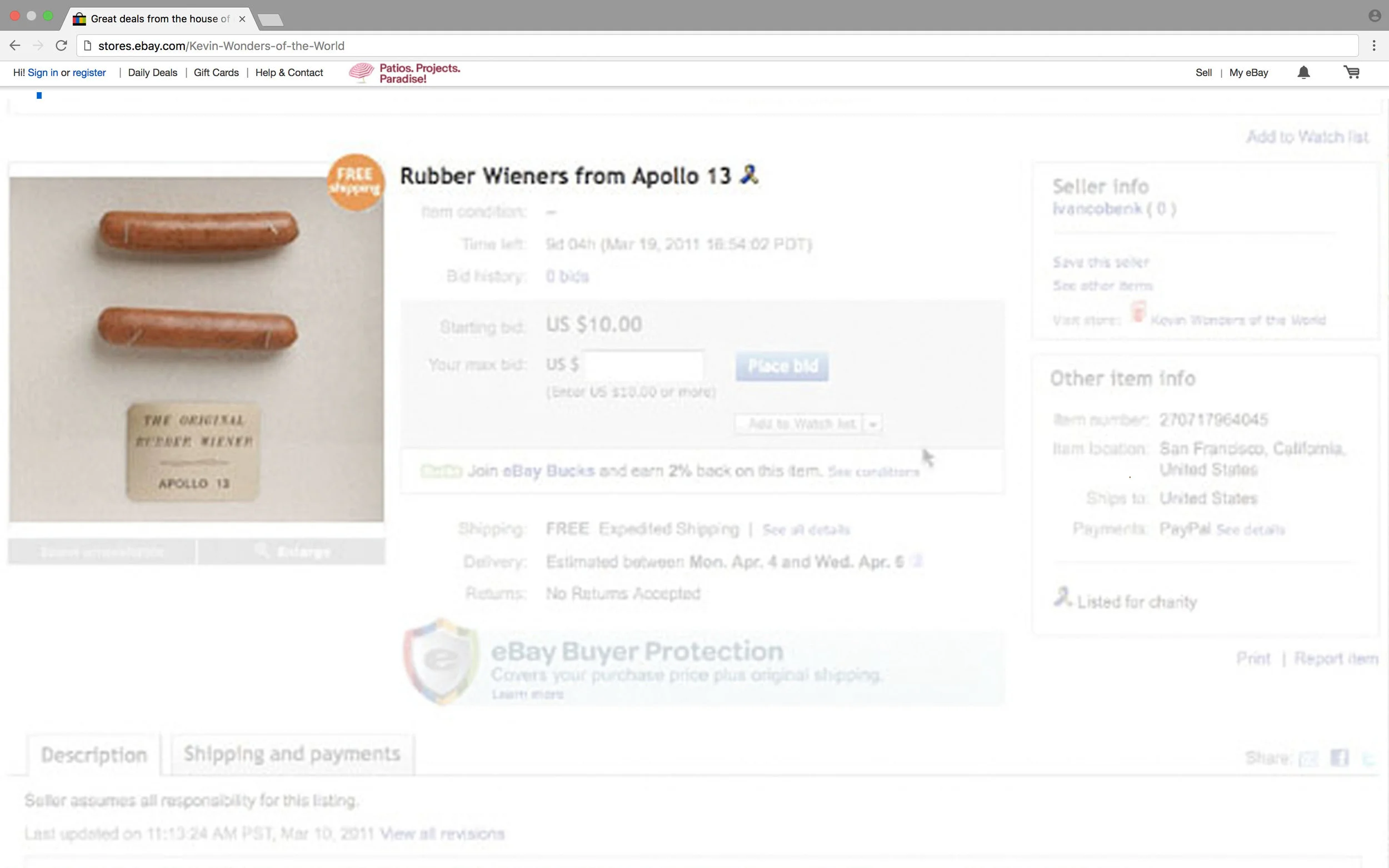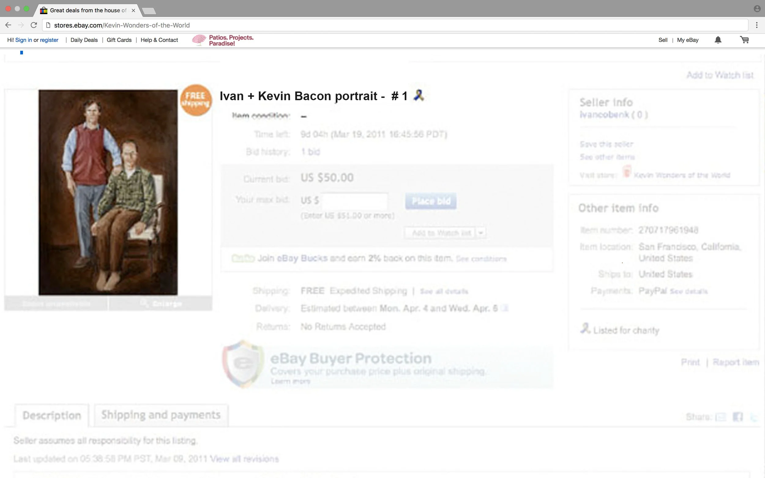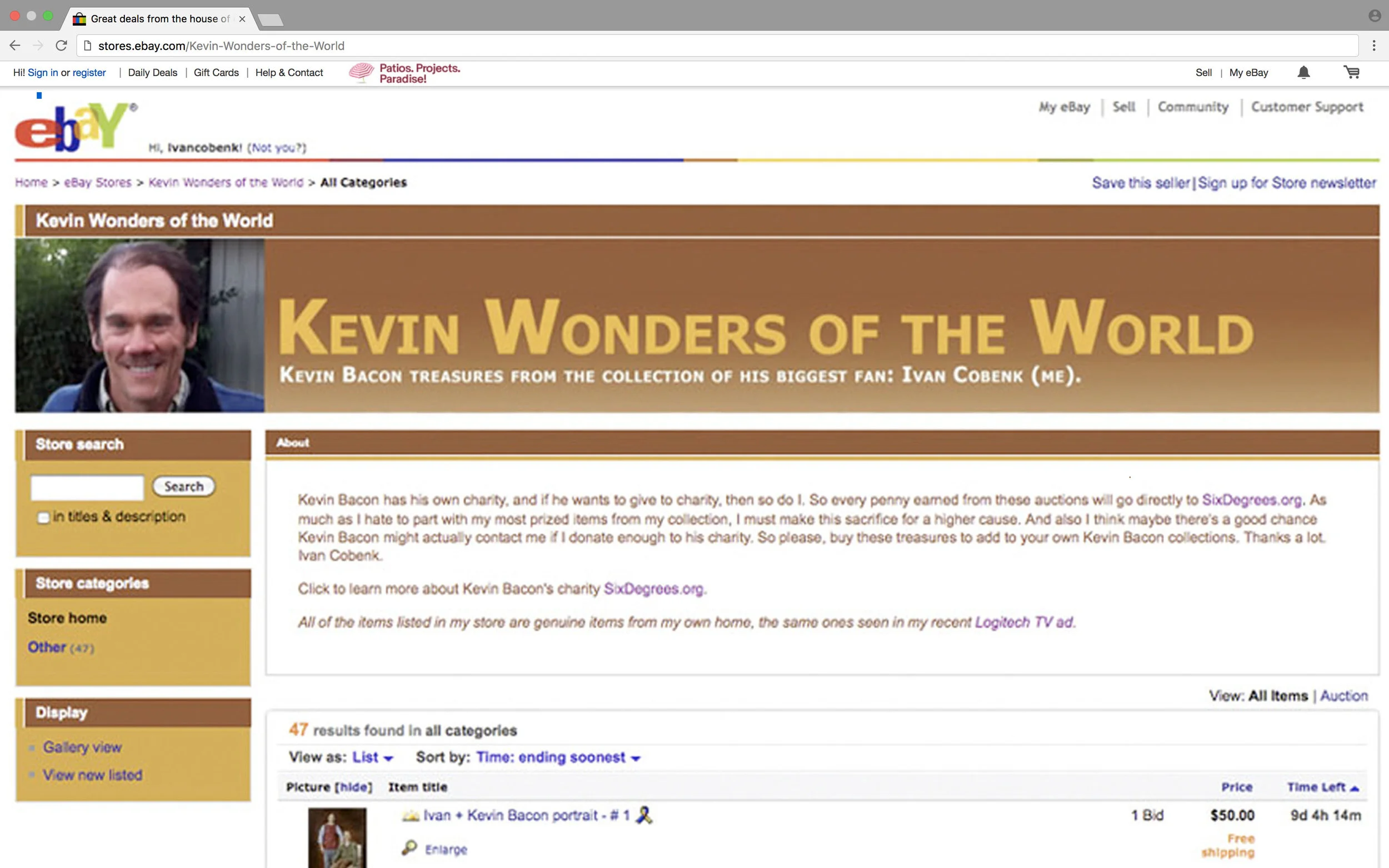 We set up an Ebay storefront for Ivan. Viewers could click on and buy everything from the spot's "extended cut" by simply clicking on the embedded YouTube links. With all proceeds being donated to Kevin Bacon's charity SixDegrees.org, everyone was a winner.